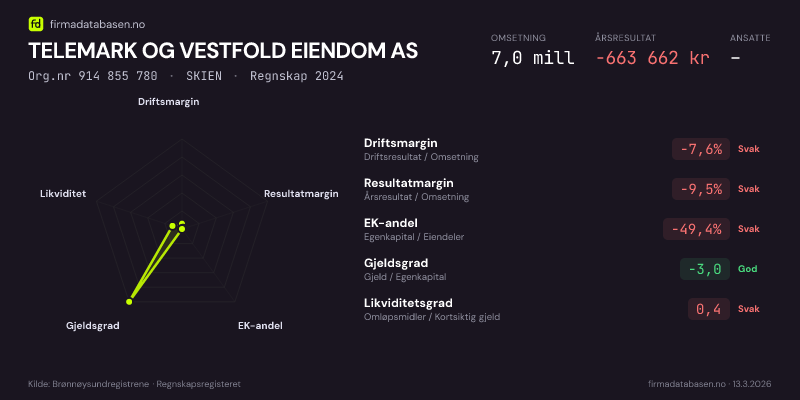 Firmadatabasen.no oppdateres nattlig med nye data fra Brønnøysundregistrene. Endringer i roller, adresse, status og andre registerdata fanges opp automatisk. Du kan følge TELEMARK OG VESTFOLD EIENDOM AS og få varsel på e-post når vi registrerer endringer — klikk «Følg selskap» øverst på denne siden.
