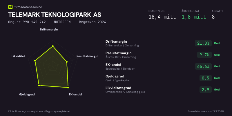 TELEMARK TEKNOLOGIPARK AS hadde en omsetning på 18,4 MNOK for regnskapsåret 2024 ifølge siste innsendte årsregnskap. Regnskapstallene hentes fra Brønnøysundregistrene.