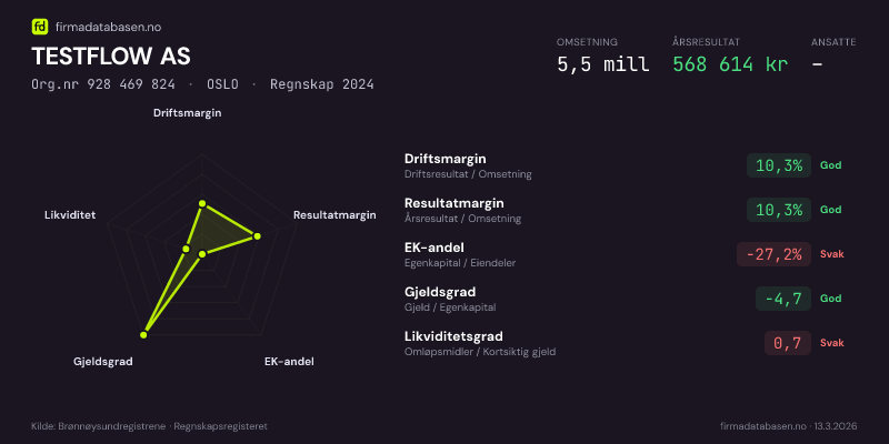 Firmadatabasen.no oppdateres nattlig med nye data fra Brønnøysundregistrene. Endringer i roller, adresse, status og andre registerdata fanges opp automatisk. Du kan følge TESTFLOW AS og få varsel på e-post når vi registrerer endringer — klikk «Følg selskap» øverst på denne siden.
