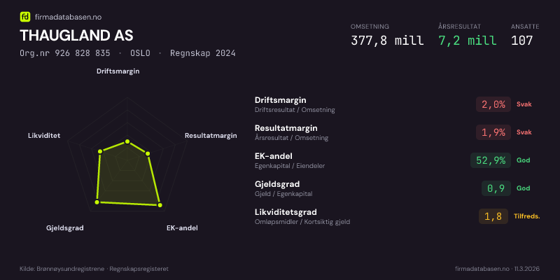 THAUGLAND AS hadde en omsetning på 377.8 mill i 2024, med driftsmargin på 2.0%.