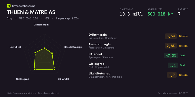 Firmadatabasen.no oppdateres nattlig med nye data fra Brønnøysundregistrene. Endringer i roller, adresse, status og andre registerdata fanges opp automatisk. Du kan følge THUEN & MATRE AS og få varsel på e-post når vi registrerer endringer — klikk «Følg selskap» øverst på denne siden.