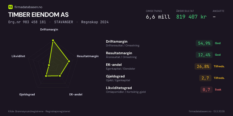 TIMBER EIENDOM AS hadde en omsetning på 6.6 mill i 2024, med driftsmargin på 54.9%.