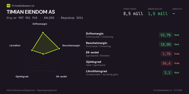 TIMIAN EIENDOM AS,HALDEN — jo større areal, jo sterkere økonomi.Org.nr 987 901 918 · Regnskap2024