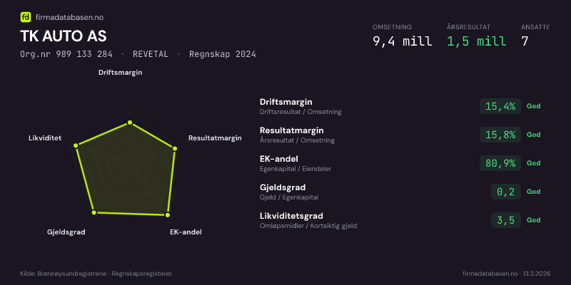 TK AUTO AS hadde en omsetning på 9,4 MNOK for regnskapsåret 2024 ifølge siste innsendte årsregnskap. Regnskapstallene hentes fra Brønnøysundregistrene.
