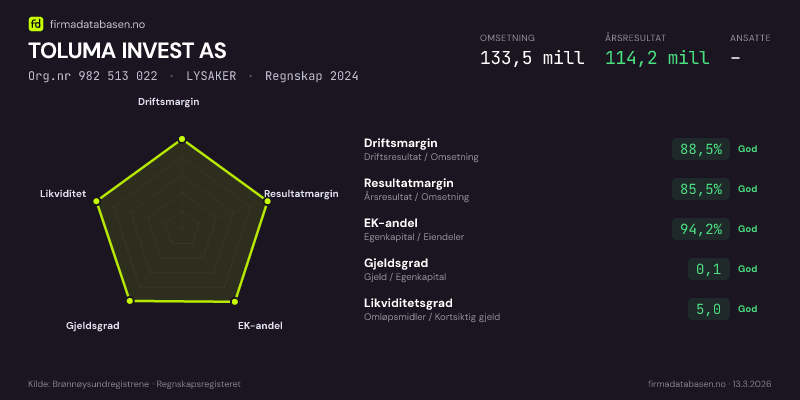 TOLUMA INVEST AS hadde en omsetning på 133,5 MNOK for regnskapsåret 2024 ifølge siste innsendte årsregnskap. Regnskapstallene hentes fra Brønnøysundregistrene.