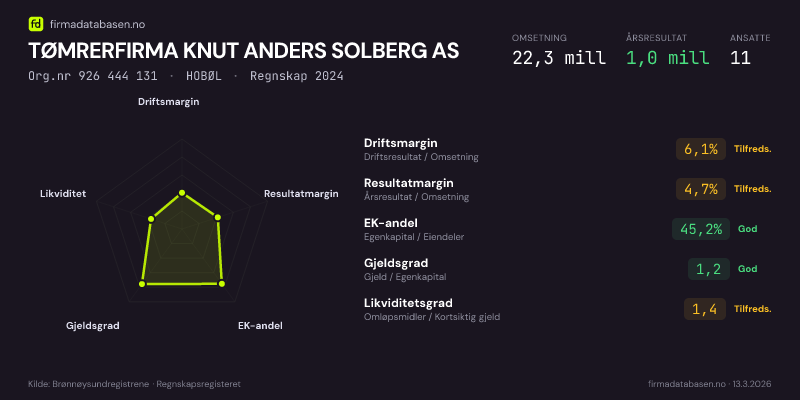 TØMRERFIRMA KNUT ANDERS SOLBERG AS,HOBØL — jo større areal, jo sterkere økonomi.Org.nr 926 444 131 · Regnskap2024