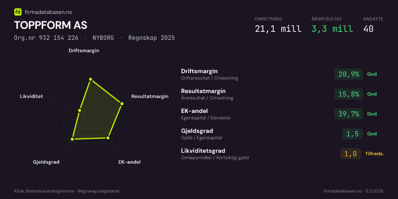 TOPPFORM AS hadde en omsetning på 21,1 MNOK for regnskapsåret 2025 ifølge siste innsendte årsregnskap. Regnskapstallene hentes fra Brønnøysundregistrene.