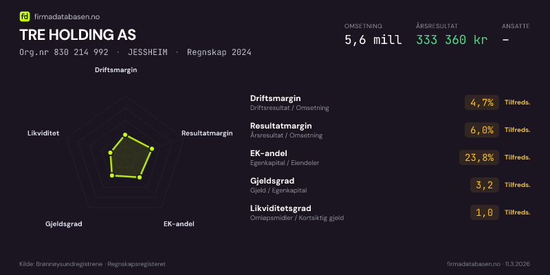 TRE HOLDING AS hadde en omsetning på 5,6 MNOK for regnskapsåret 2024 ifølge siste innsendte årsregnskap. Regnskapstallene hentes fra Brønnøysundregistrene.