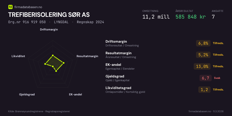 TREFIBERISOLERING SØR AS hadde en omsetning på 11.2 mill i 2024, med driftsmargin på 6.8%.