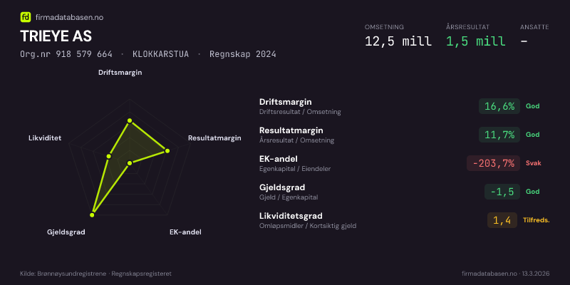 TRIEYE AS hadde en omsetning på 12,5 MNOK for regnskapsåret 2024 ifølge siste innsendte årsregnskap. Regnskapstallene hentes fra Brønnøysundregistrene.