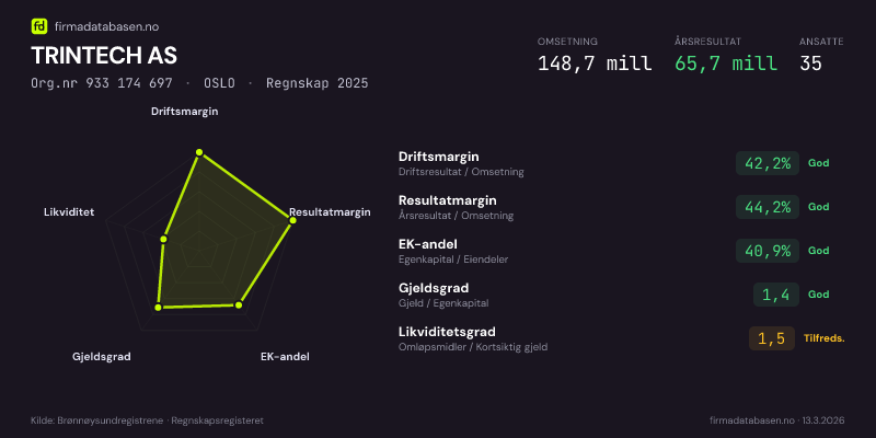 TRINTECH AS hadde en omsetning på 148,7 MNOK for regnskapsåret 2025 ifølge siste innsendte årsregnskap. Regnskapstallene hentes fra Brønnøysundregistrene.