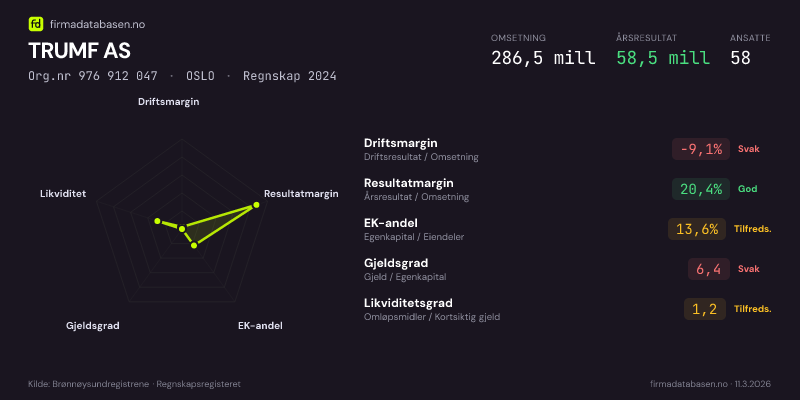 TRUMF AS hadde en omsetning på 286.5 mill i 2024, med driftsmargin på -9.1%.