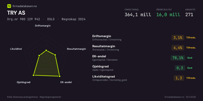 TRY AS hadde en omsetning på 364.1 mill i 2024, med driftsmargin på 3.1%.