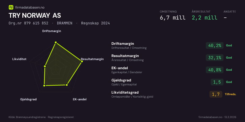 TRY NORWAY AS,DRAMMEN — jo større areal, jo sterkere økonomi.Org.nr 879 615 852 · Regnskap2024