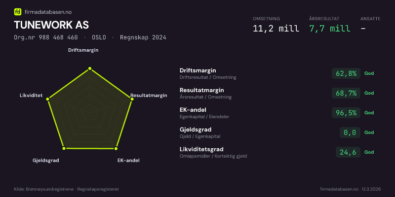 TUNEWORK AS er et aksjeselskap, innen annen teknisk konsulentvirksomhet, stiftet i 2005 i Oslo. I 2024 hadde selskapet en omsetning på 11.2 mill og en driftsmargin på 62.8 %.