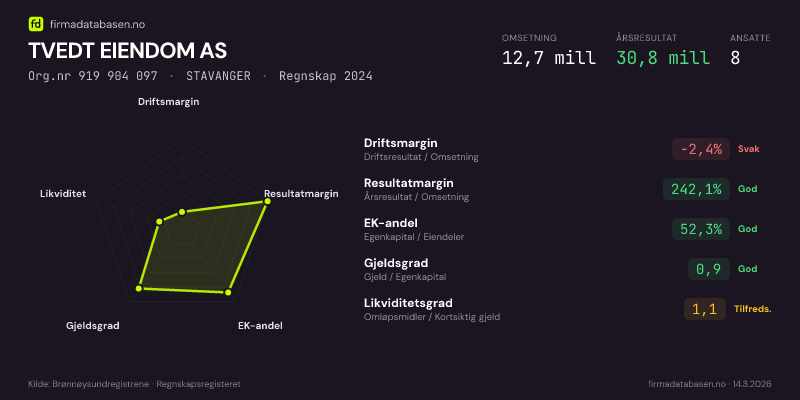 TVEDT EIENDOM AS,STAVANGER — jo større areal, jo sterkere økonomi.Org.nr 919 904 097 · Regnskap2024
