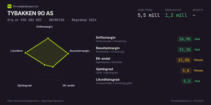 TYBAKKEN 90 AS hadde en omsetning på 5.5 mill i 2024, med driftsmargin på 26.9%.