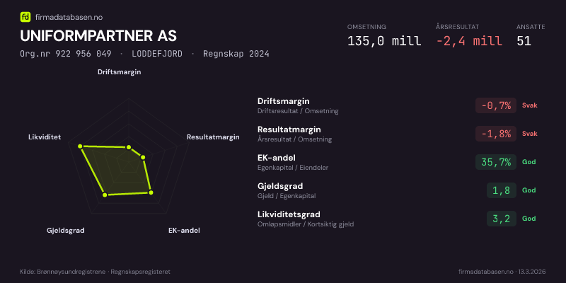 UNIFORMPARTNER AS hadde en omsetning på 135.0 mill i 2024, med driftsmargin på -0.7%.
