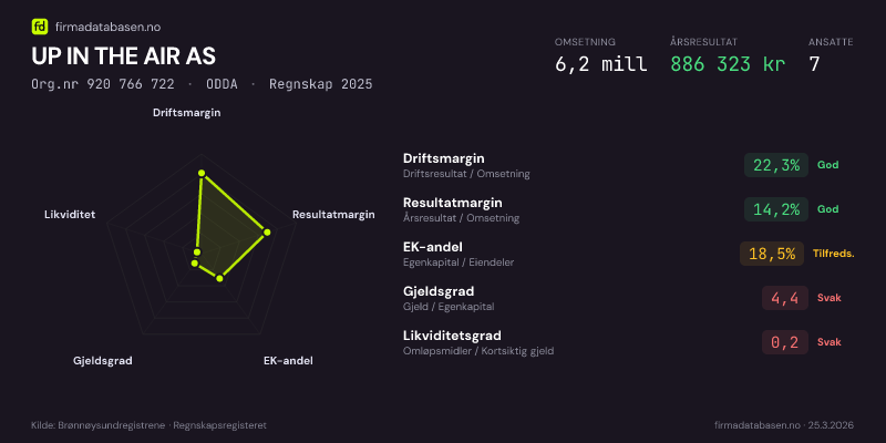 UP IN THE AIR AS hadde en omsetning på 6,2 MNOK for regnskapsåret 2025 ifølge siste innsendte årsregnskap. Regnskapstallene hentes fra Brønnøysundregistrene.