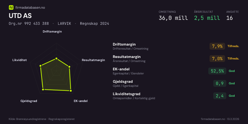 UTD AS,LARVIK — jo større areal, jo sterkere økonomi.Org.nr 992 433 388 · Regnskap2024