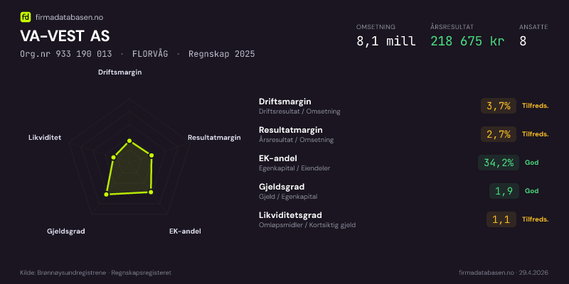 VA-VEST AS,FLORVÅG — jo større areal, jo sterkere økonomi.Org.nr 933 190 013 · Regnskap2024