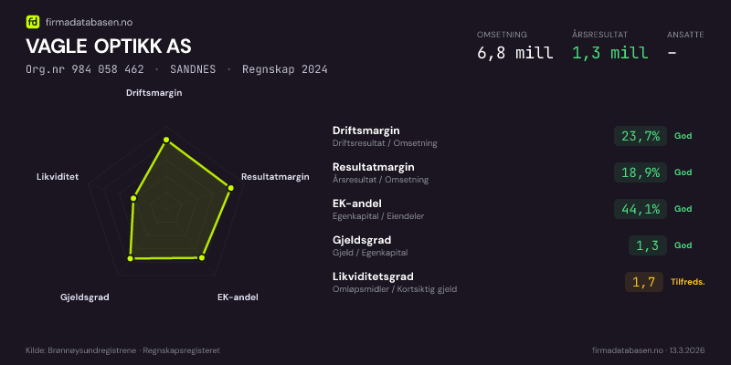 VAGLE OPTIKK AS hadde en omsetning på 6.8 mill i 2024, med driftsmargin på 23.7%.