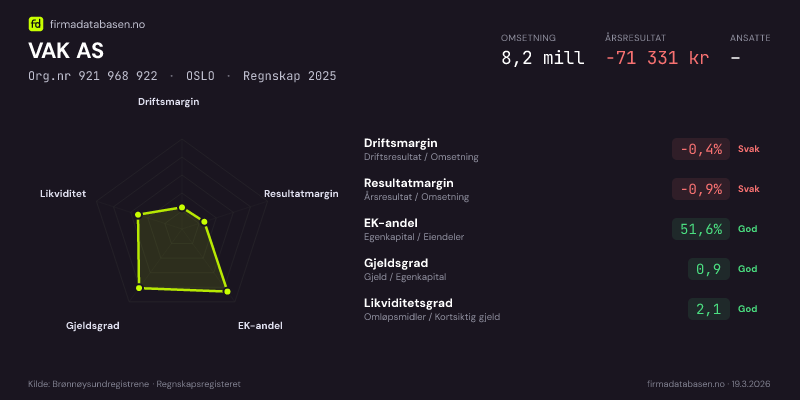 VAK AS hadde en omsetning på 8,2 MNOK for regnskapsåret 2025 ifølge siste innsendte årsregnskap. Regnskapstallene hentes fra Brønnøysundregistrene.