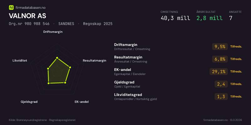 VALNOR AS hadde en omsetning på 40,3 MNOK for regnskapsåret 2025 ifølge siste innsendte årsregnskap. Regnskapstallene hentes fra Brønnøysundregistrene.