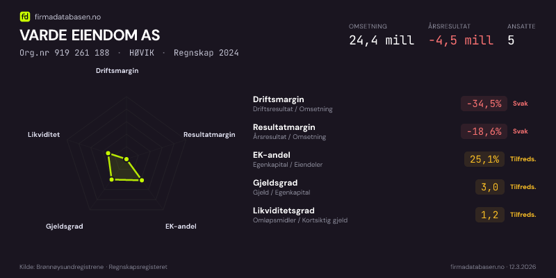 Firmadatabasen.no oppdateres nattlig med nye data fra Brønnøysundregistrene. Endringer i roller, adresse, status og andre registerdata fanges opp automatisk. Du kan følge VARDE EIENDOM AS og få varsel på e-post når vi registrerer endringer — klikk «Følg selskap» øverst på denne siden.