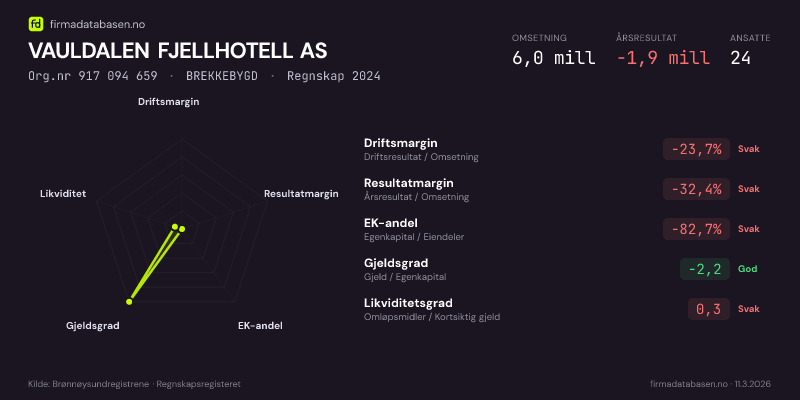 Firmadatabasen.no oppdateres nattlig med nye data fra Brønnøysundregistrene. Endringer i roller, adresse, status og andre registerdata fanges opp automatisk. Du kan følge VAULDALEN FJELLHOTELL AS og få varsel på e-post når vi registrerer endringer — klikk «Følg selskap» øverst på denne siden.