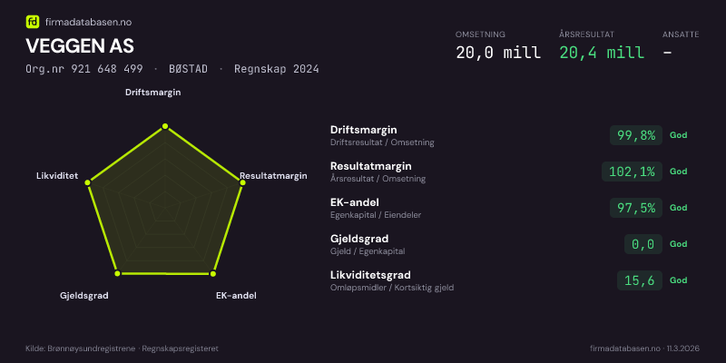 VEGGEN AS,BØSTAD — jo større areal, jo sterkere økonomi.Org.nr 921 648 499 · Regnskap2024