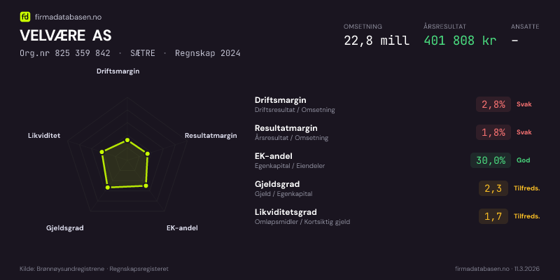 Firmadatabasen.no oppdateres nattlig med nye data fra Brønnøysundregistrene. Endringer i roller, adresse, status og andre registerdata fanges opp automatisk. Du kan følge VELVÆRE AS og få varsel på e-post når vi registrerer endringer — klikk «Følg selskap» øverst på denne siden.
