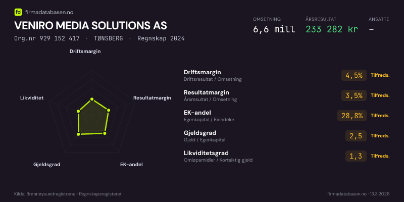 VENIRO MEDIA SOLUTIONS AS,TØNSBERG — jo større areal, jo sterkere økonomi.Org.nr 929 152 417 · Regnskap2024