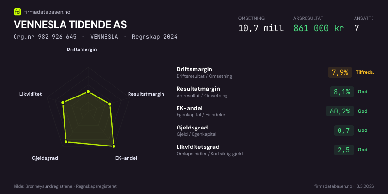 VENNESLA TIDENDE AS hadde en omsetning på 10.7 mill i 2024, med driftsmargin på 7.9%.
