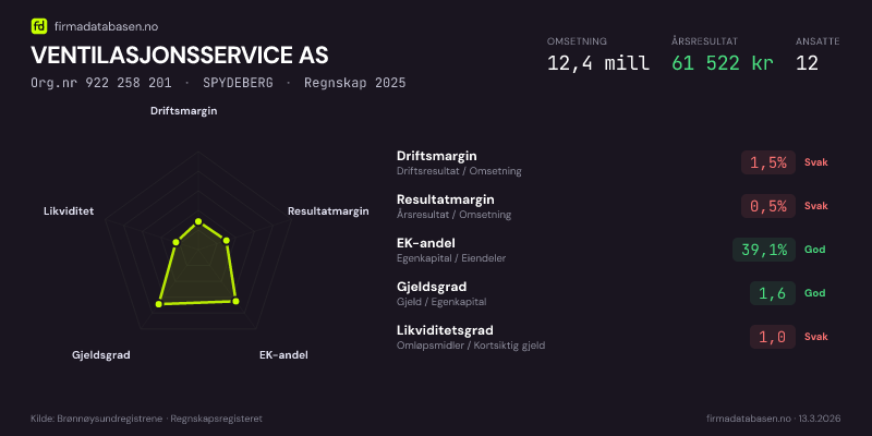 VENTILASJONSSERVICE AS,SPYDEBERG — jo større areal, jo sterkere økonomi.Org.nr 922 258 201 · Regnskap2025