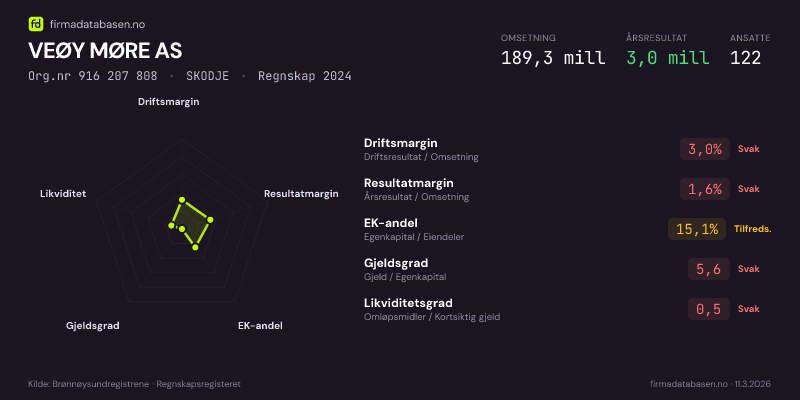 VEØY MØRE AS hadde en omsetning på 189,3 MNOK for regnskapsåret 2024 ifølge siste innsendte årsregnskap. Regnskapstallene hentes fra Brønnøysundregistrene.