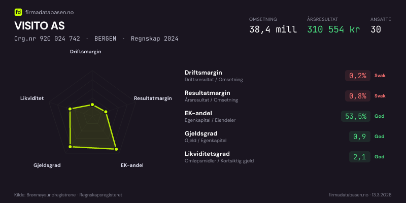 VISITO AS hadde en omsetning på 38,4 MNOK for regnskapsåret 2024 ifølge siste innsendte årsregnskap. Regnskapstallene hentes fra Brønnøysundregistrene.
