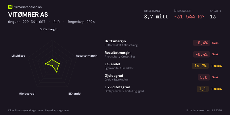 VITØMRER AS hadde en omsetning på 8,7 MNOK for regnskapsåret 2024 ifølge siste innsendte årsregnskap. Regnskapstallene hentes fra Brønnøysundregistrene.