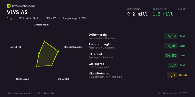 VLYS AS hadde en omsetning på 9,2 MNOK for regnskapsåret 2025 ifølge siste innsendte årsregnskap. Regnskapstallene hentes fra Brønnøysundregistrene.