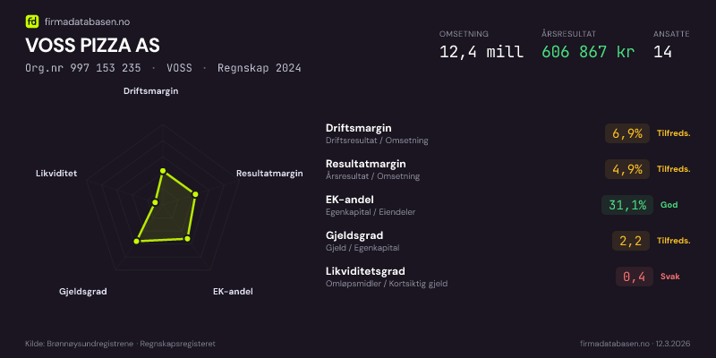 VOSS PIZZA AS hadde en omsetning på 12,4 MNOK for regnskapsåret 2024 ifølge siste innsendte årsregnskap. Regnskapstallene hentes fra Brønnøysundregistrene.