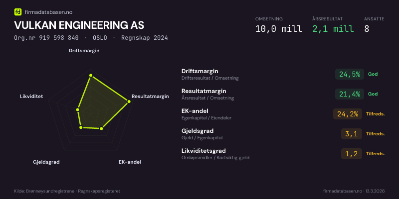 Firmadatabasen.no oppdateres nattlig med nye data fra Brønnøysundregistrene. Endringer i roller, adresse, status og andre registerdata fanges opp automatisk. Du kan følge VULKAN ENGINEERING AS og få varsel på e-post når vi registrerer endringer — klikk «Følg selskap» øverst på denne siden.