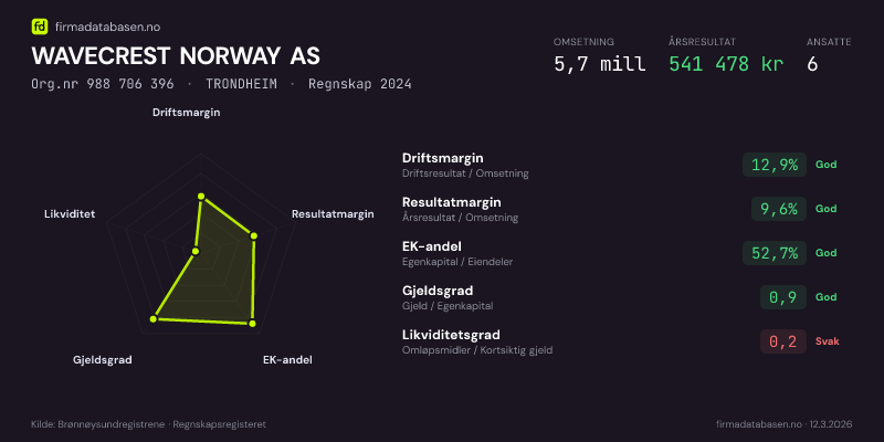 WAVECREST NORWAY AS,STJØRDAL — jo større areal, jo sterkere økonomi.Org.nr 988 706 396 · Regnskap2024