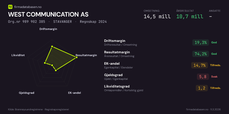 WEST COMMUNICATION AS hadde en omsetning på 14,5 MNOK for regnskapsåret 2024 ifølge siste innsendte årsregnskap. Regnskapstallene hentes fra Brønnøysundregistrene.