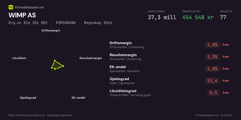WIMP AS hadde en omsetning på 37,3 MNOK for regnskapsåret 2024 ifølge siste innsendte årsregnskap. Regnskapstallene hentes fra Brønnøysundregistrene.