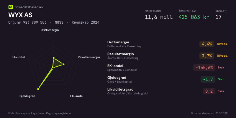 WYX AS hadde en omsetning på 11,6 MNOK for regnskapsåret 2024 ifølge siste innsendte årsregnskap. Regnskapstallene hentes fra Brønnøysundregistrene.