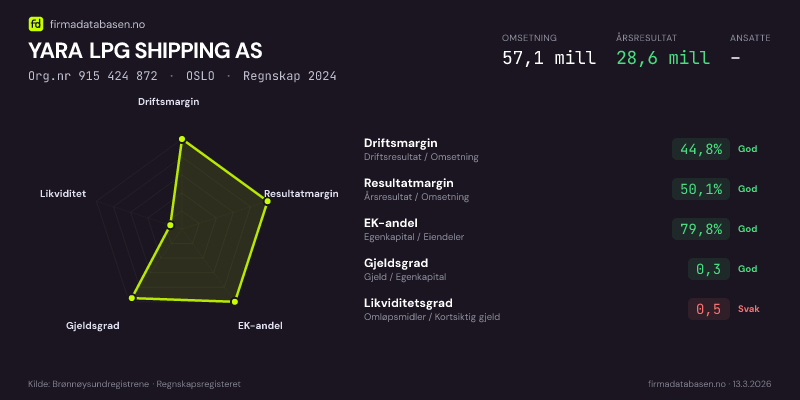 YARA LPG SHIPPING AS hadde en omsetning på 57,1 MNOK for regnskapsåret 2024 ifølge siste innsendte årsregnskap. Regnskapstallene hentes fra Brønnøysundregistrene.