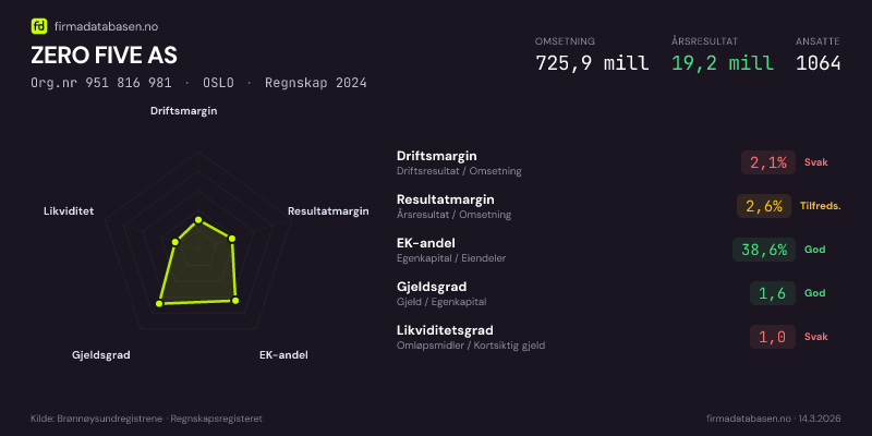 ZERO FIVE AS hadde en omsetning på 725.9 mill i 2024, med driftsmargin på 2.1%.