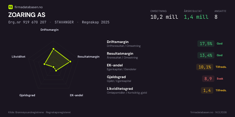 ZOARING AS hadde en omsetning på 10.2 mill i 2025, med driftsmargin på 17.5%.