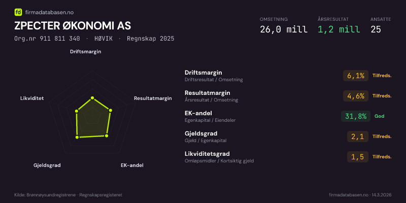 ZPECTER ØKONOMI AS hadde en omsetning på 26,0 MNOK for regnskapsåret 2025 ifølge siste innsendte årsregnskap. Regnskapstallene hentes fra Brønnøysundregistrene.